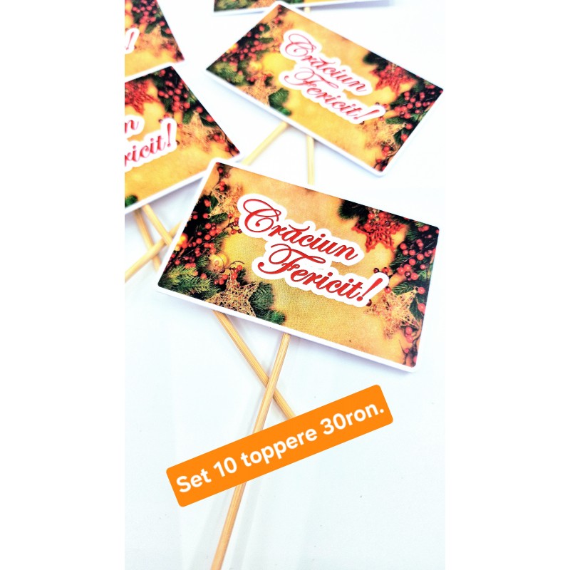 Set de 10 toppere din carton, cu textul Craciun Fericit! Dimensiuni cartonas:8*5cm. Lungime betisor 9cm. Ideal pentru decorarea torturilor, cadourilor, buchetelor de flori.