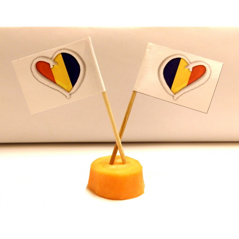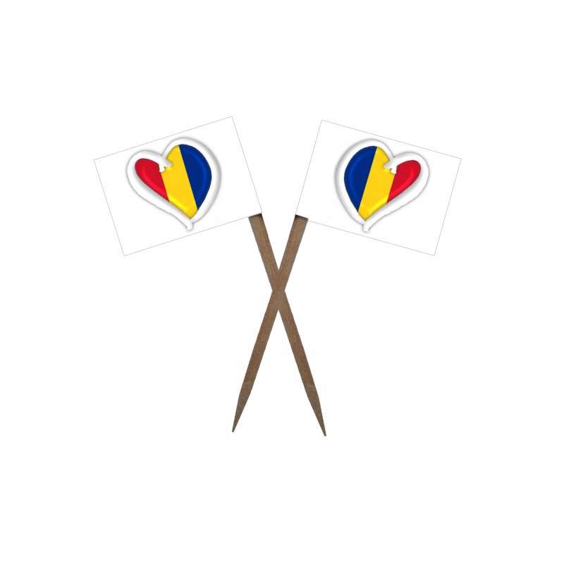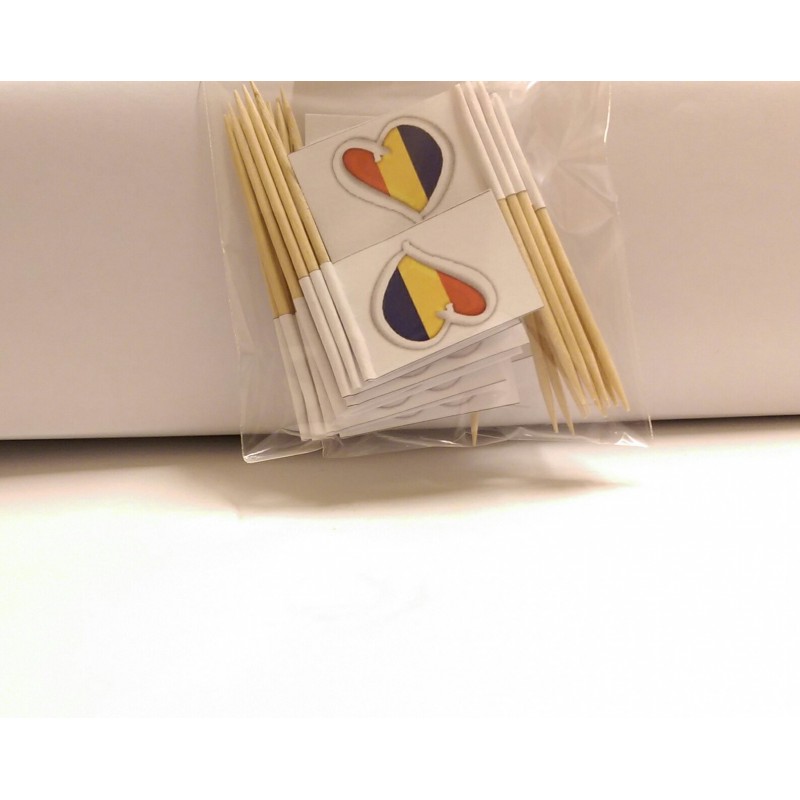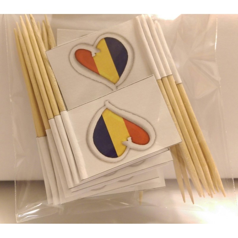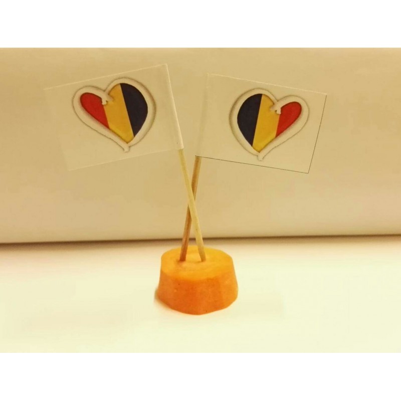 Scobitoare cu Stegulet pentru Marea Sarbatoare Nationala -1 Decembrie. Dimensiuni steag 2.5cmx3.6cm, scobitoare 6,3cm. Inima imprimata, forma steag dreptunghiular. Set de 25 de bucati.